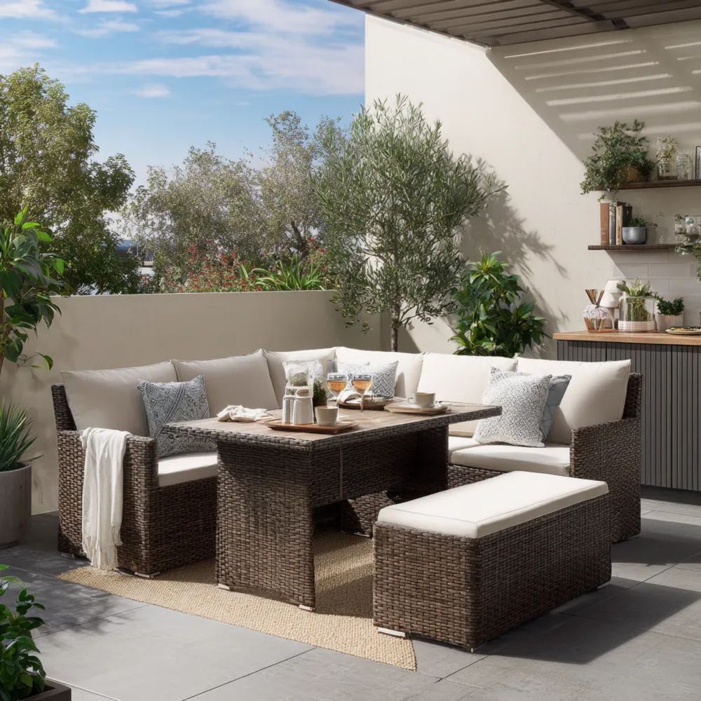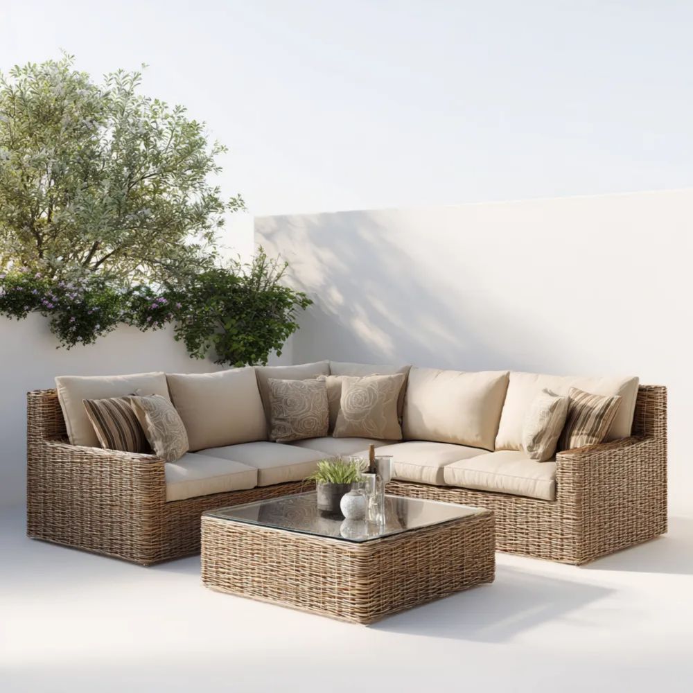 Set Divano Angolare da Esterno in Rattan 180x70x70 cm – Marrone/Beige – Design Moderno