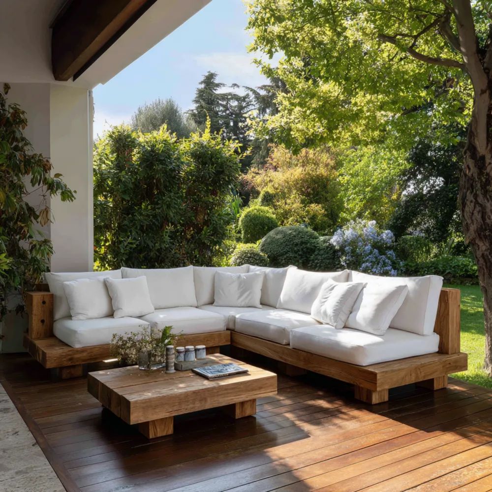 Set di divani da esterno 230x230x70 cm in legno massello con cuscini Bianchi – Design moderno