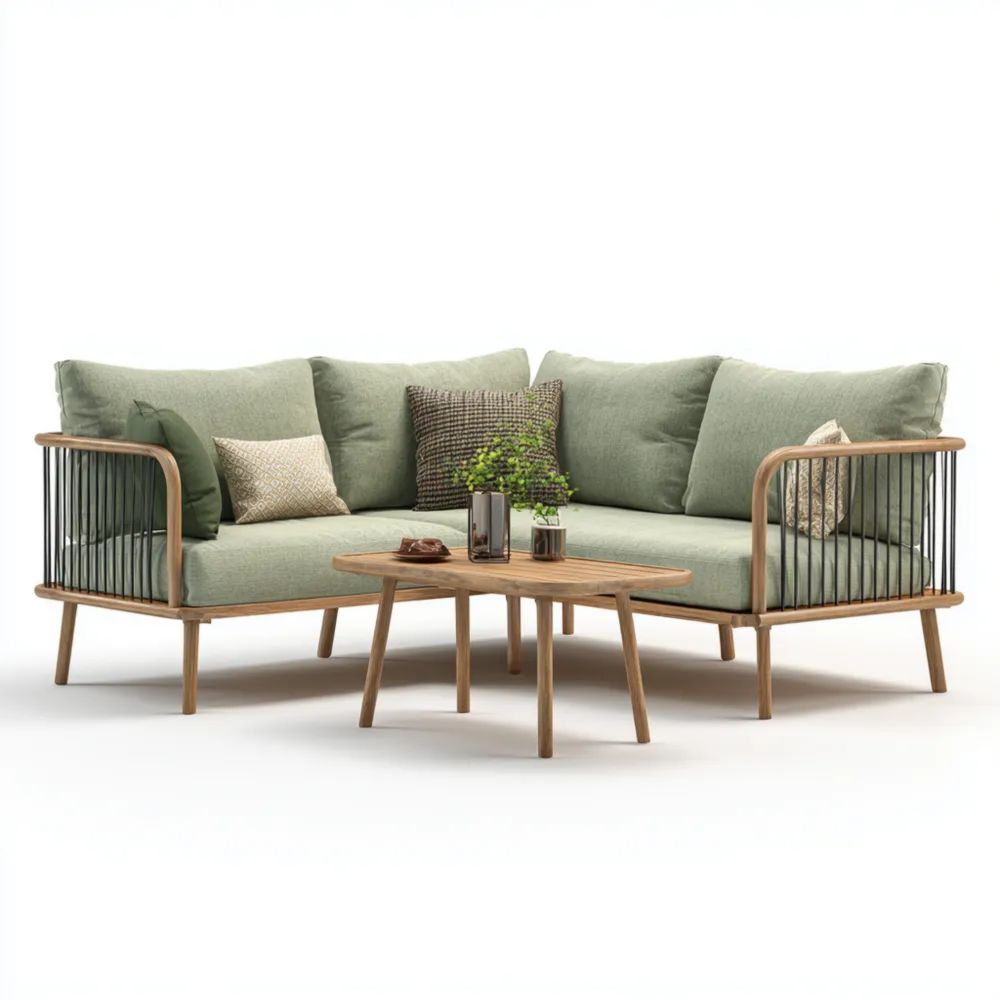 Materiale e lavorazioneRealizzato con una robusta struttura in legno e dettagli in metallo, il divano è accompagnato da cuscini in tessuto resistente all'acqua di colore Verde/Naturale.