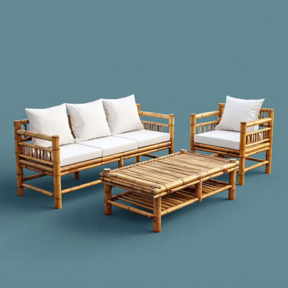 Materiale e lavorazioneI divani sono costruiti in bambù resistente, conosciuto per la sua durabilità e resistenza agli agenti atmosferici. I cuscini bianchi sono realizzati in tessuto idrorepellente e facili da pulire.